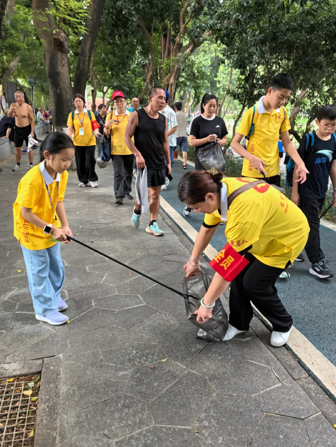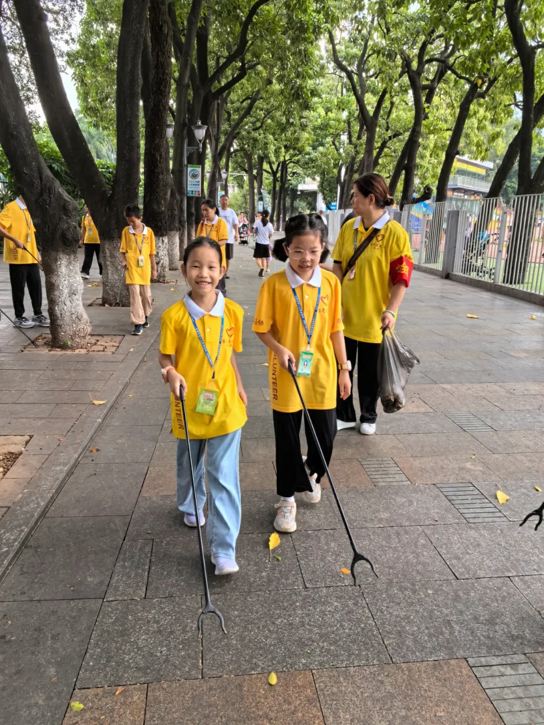 到了人民公园,我一眼就看到好多穿着黄色队服的小伙伴,大家像一朵朵小黄花,特别显眼。我们每人领到一把小钳子和一个垃圾袋,跟着大部队出发啦!走在路上,大家齐声喊着口号:“垃圾不落地,东莞更美丽,保护环境,人人有责!” 响亮的声音在公园里回荡。